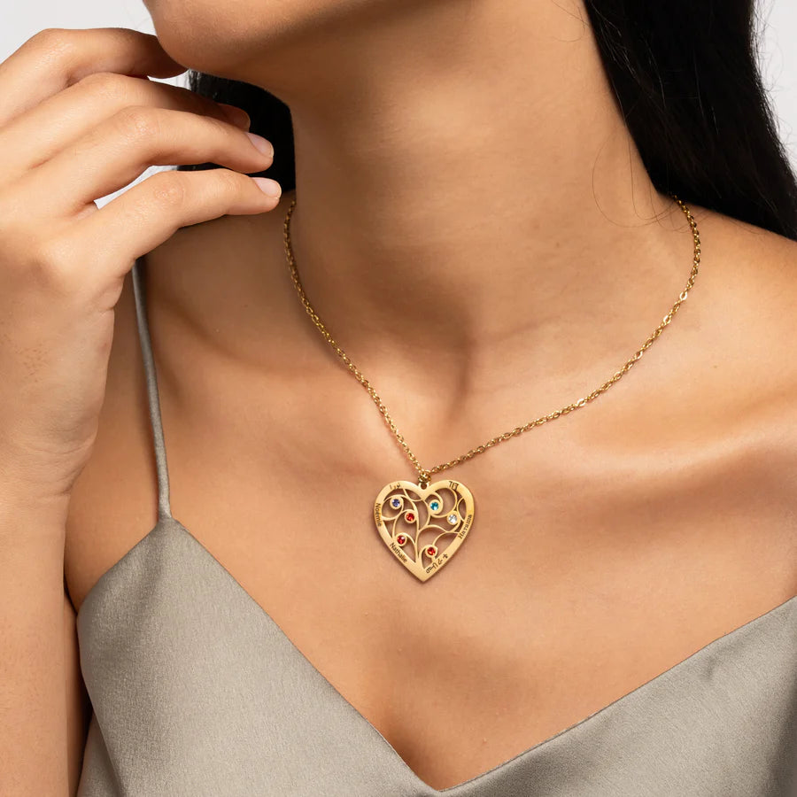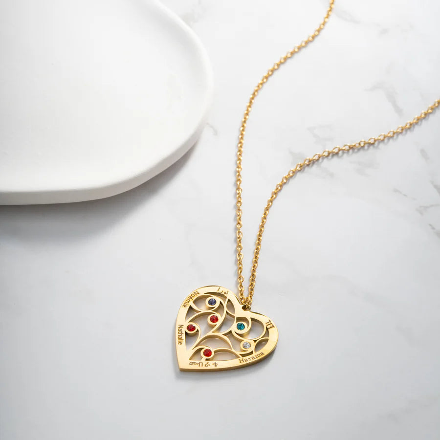 The heart-shaped pendant, a timeless symbol of love and affection, can be expertly engraved with up to five names or messages that matter most to you. Each inscription is beautifully complemented by a corresponding birthstone, elegantly incorporated into delicate arabesques that flow throughout the heart. It's a personal touch that adds depth and richness to this remarkable piece. ✨