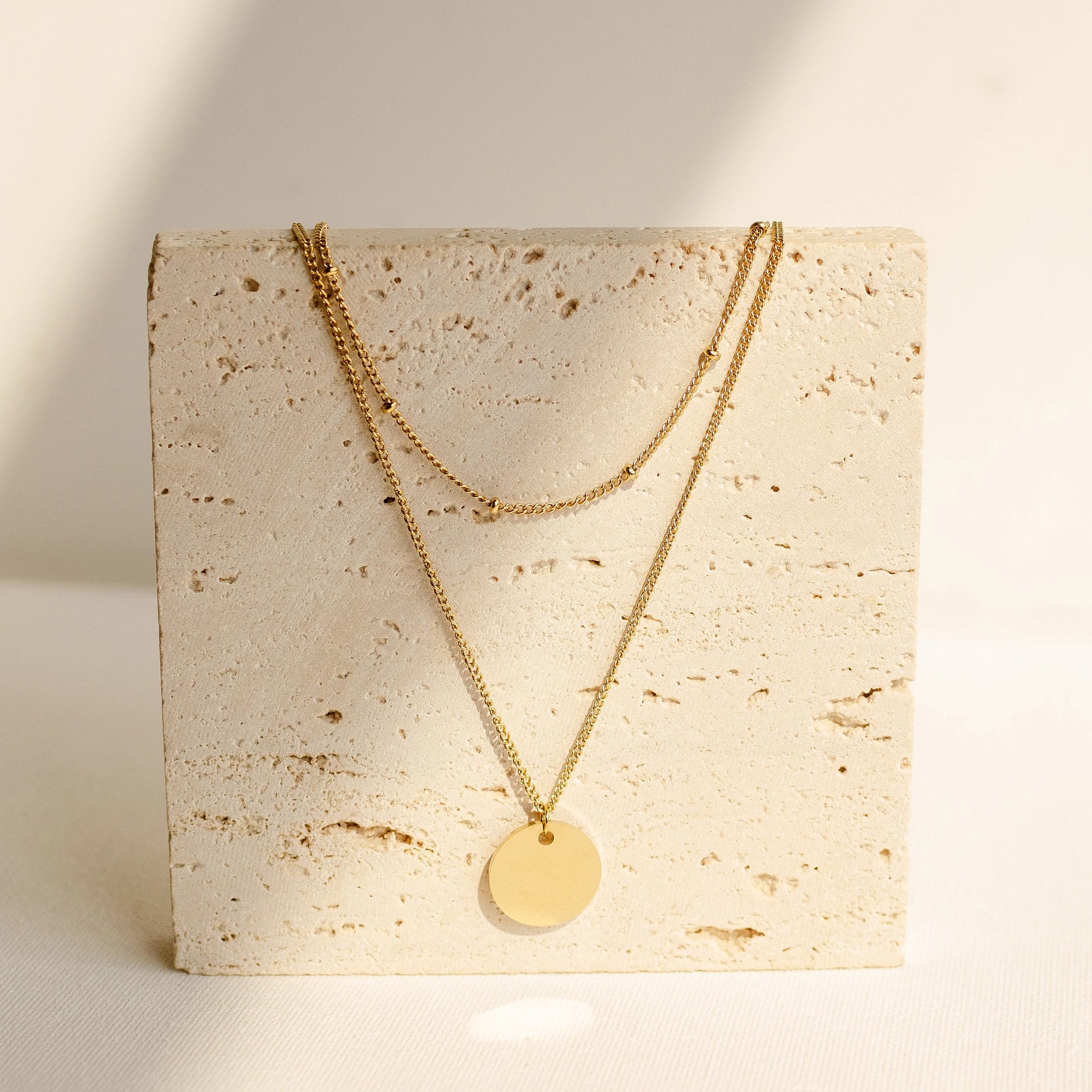 • An elegant double-stranded necklace with delicate metallic beads & a circular pendant: (13.5"(34cm)/16"(40.5cm) + 2"(5cm) extension, 0.4"(1cm diameter) pendant, 0.24 oz 💖